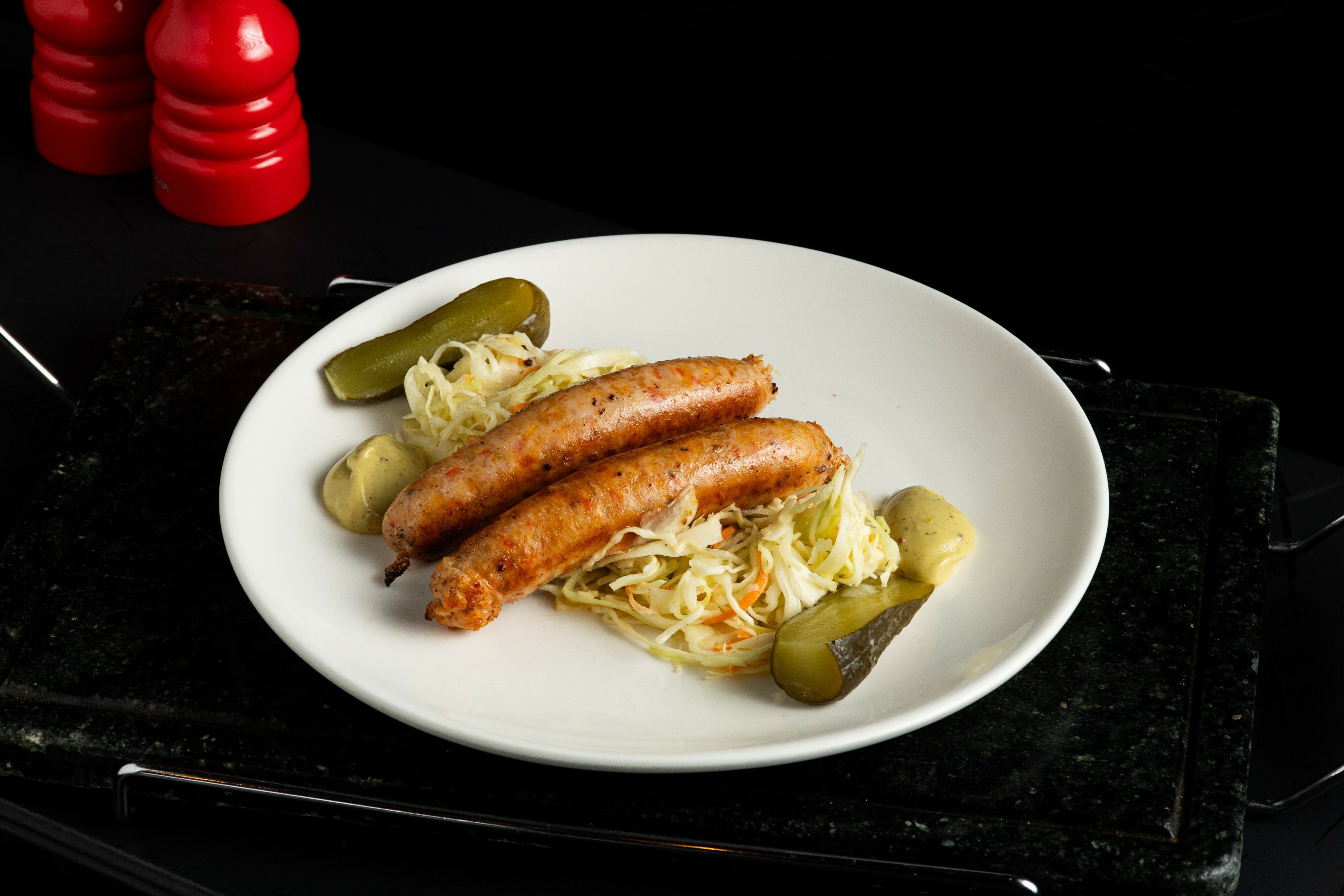 Домашние сосиски с коул-слоу и медовой горчицей